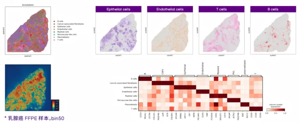 基于 FFPE 样本中的基因表达空间信息,注释多种细胞类型,并精准定位各种细胞类型的空间分布。