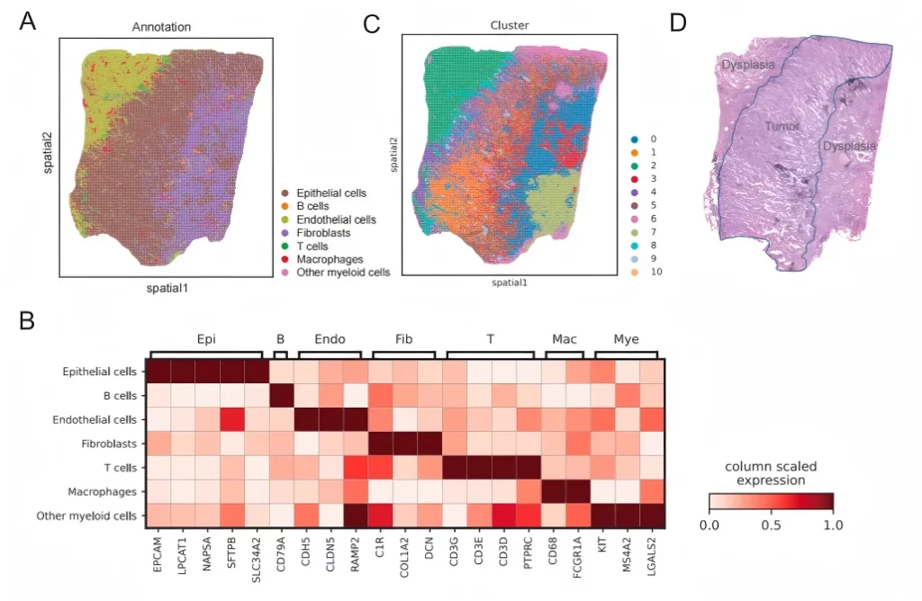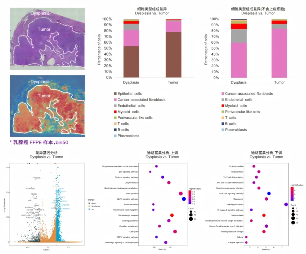 基于 H&E 提供的组织学信息进行组织分型,从而深入探究癌前区及癌区的空间分子特征。