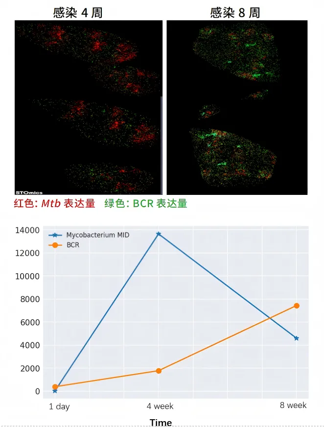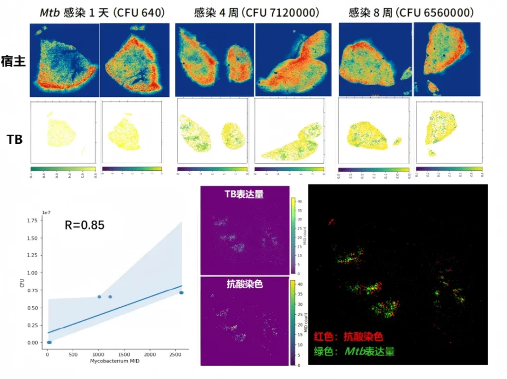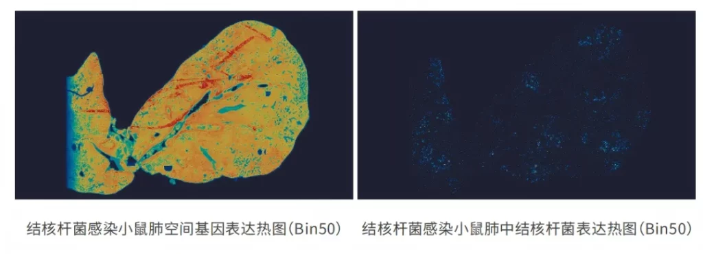 在感染鼠肺样本中结核分支杆菌 (Mtb) 的空间转录组检测数据与病理染色结果吻合。
