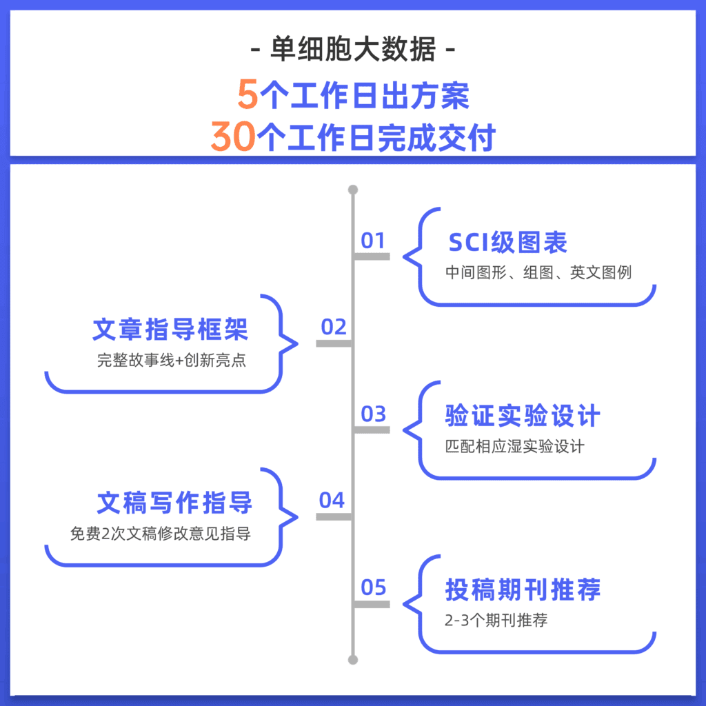 A:「单细胞大数据」交付您的是数据挖掘的完整的故事线,不单单是一堆图表。结果交付后,我们会提供数据解读以及写作指导,您文章写好后,我们还会提供2次免费的文章投稿意见指导。