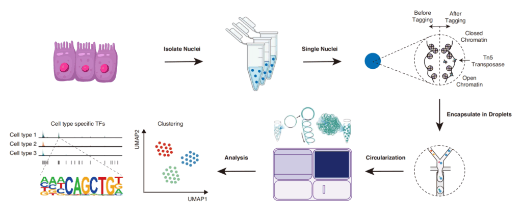 从生物样本(如组织等)中分离出细胞核,接着对细胞核进行转座酶处理,使染色质开放区域 DNA 片段化,然后利用DNBelab C系列平台进行单细胞分选,将处理后的 DNA 构建文库,再通过测序获取数据,后续经数据分析(如峰识别、聚类、 motif 富集等),以解析单细胞染色质可及性信息 。