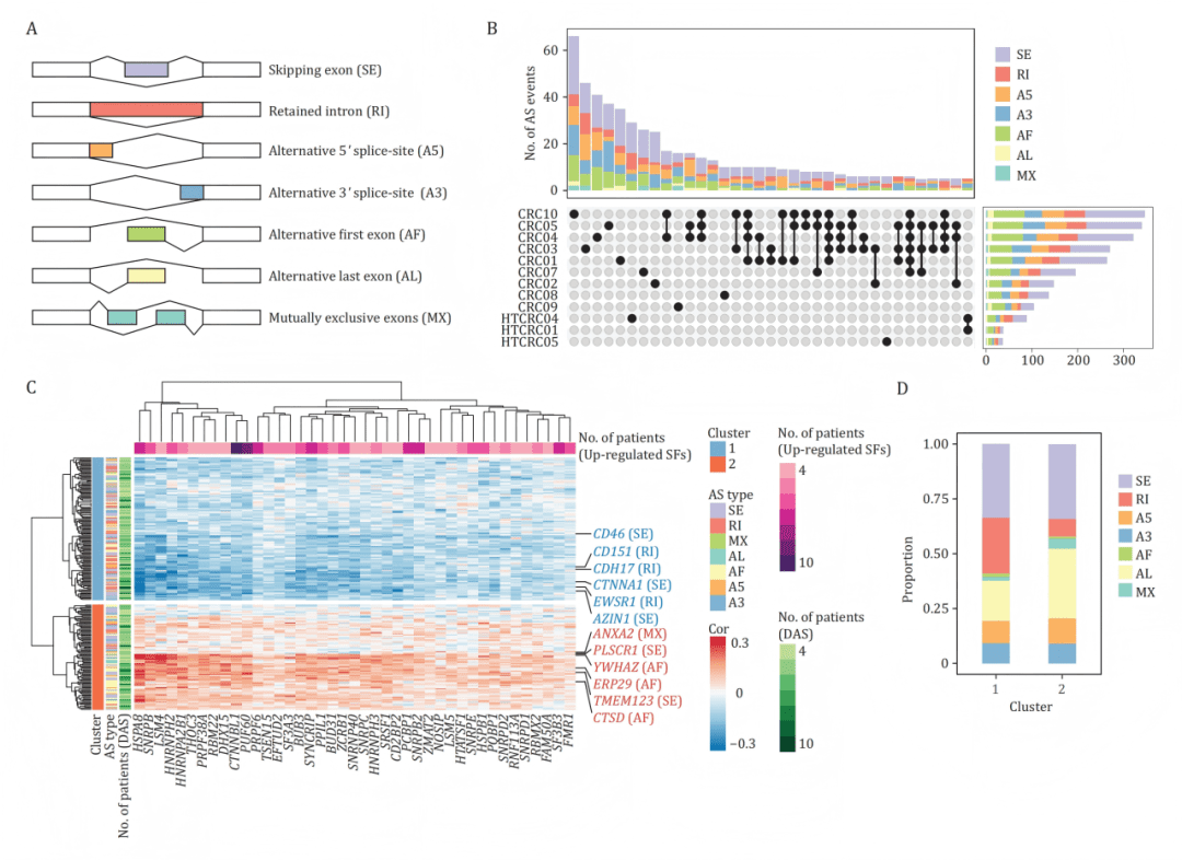 同时,作者系统分析了 7 类主要剪接事件(SE、RI、A5、A3、AF、AL、MX) 的差异,识别了跨患者共享的异常剪接,并通过相关性分析揭示剪接因子与特定 AS 事件的潜在调控关系。