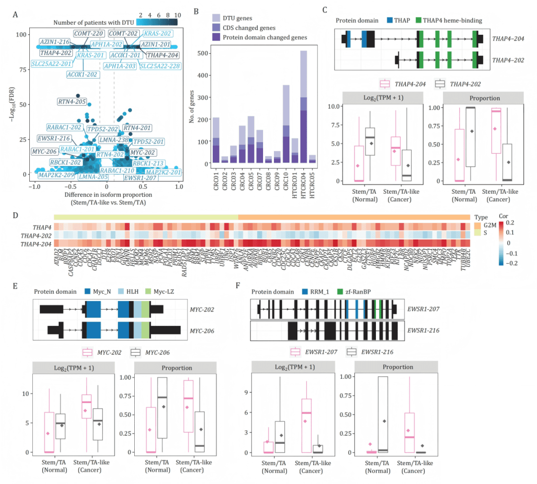 C-F:以THAP4、MYC、EWSR1为例,详细展示其主导异构体在癌变过程中的转换(C, E, F上)、蛋白质结构域差异(C, E, F下),以及THAP4异构体与细胞周期基因的相关性(D)。