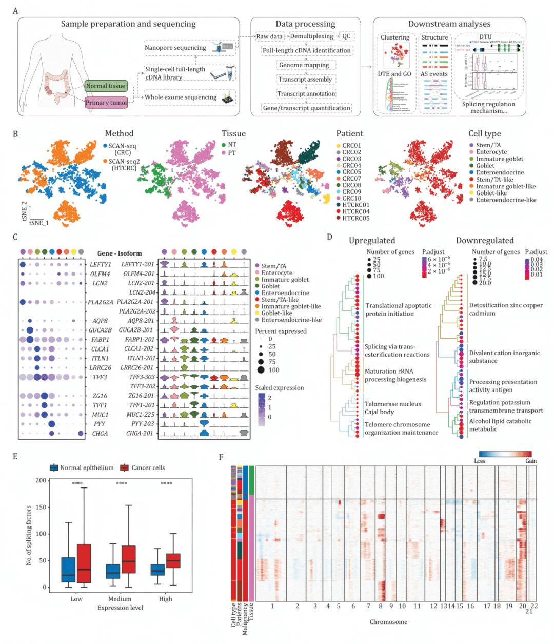 研究团队采用 SCAN-seq 与 SCAN-seq2 两种长读长单细胞测序技术,对 12 位结直肠癌患者的肿瘤与邻近正常组织进行测序。通过严格的 QC、比对与转录本拼装,获得高质量全长 RNA 序列,并对细胞进行聚类,区分正常上皮与癌细胞亚群。