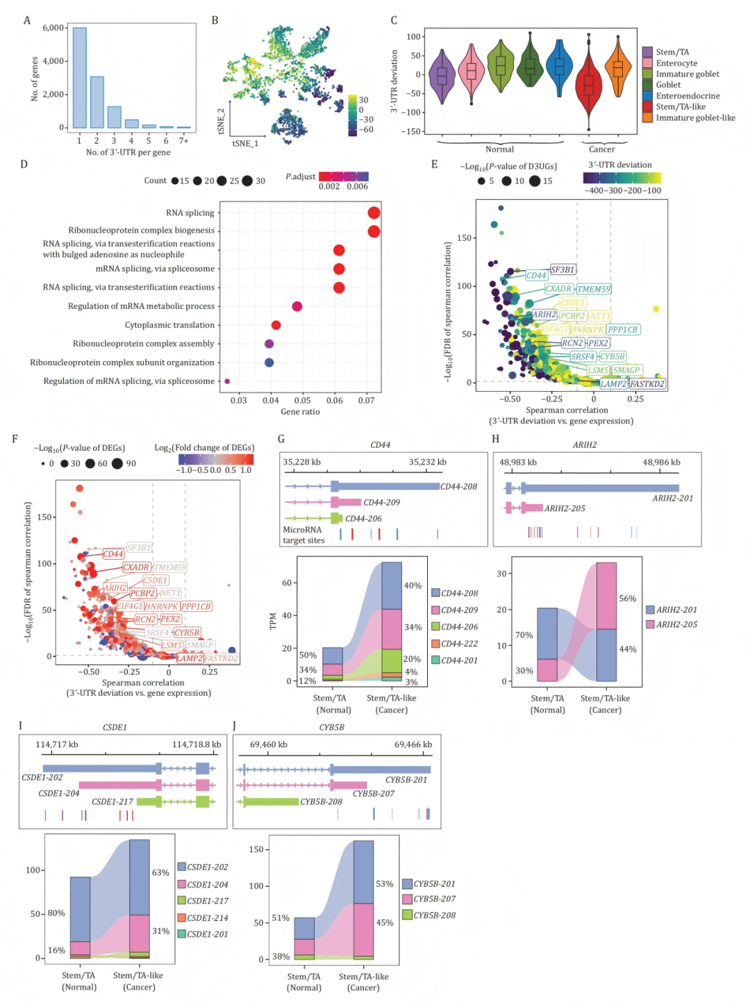 G-J:以CD44、ARIH2等基因为例,展示其缩短的3‘-UTR异构体结构(失去部分miRNA结合位点)及其在癌细胞中表达比例上升。
