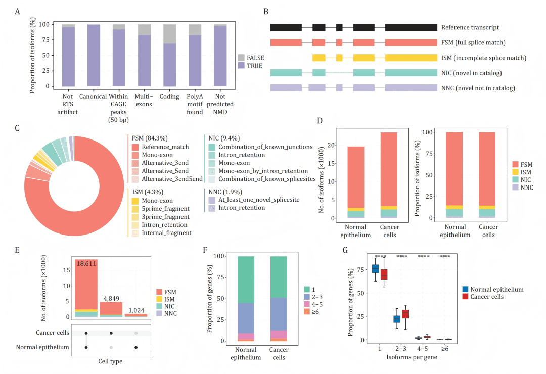 F-G:癌细胞中表达多个异构体的基因比例更高,且主要表达集中在1-2个主导异构体上。