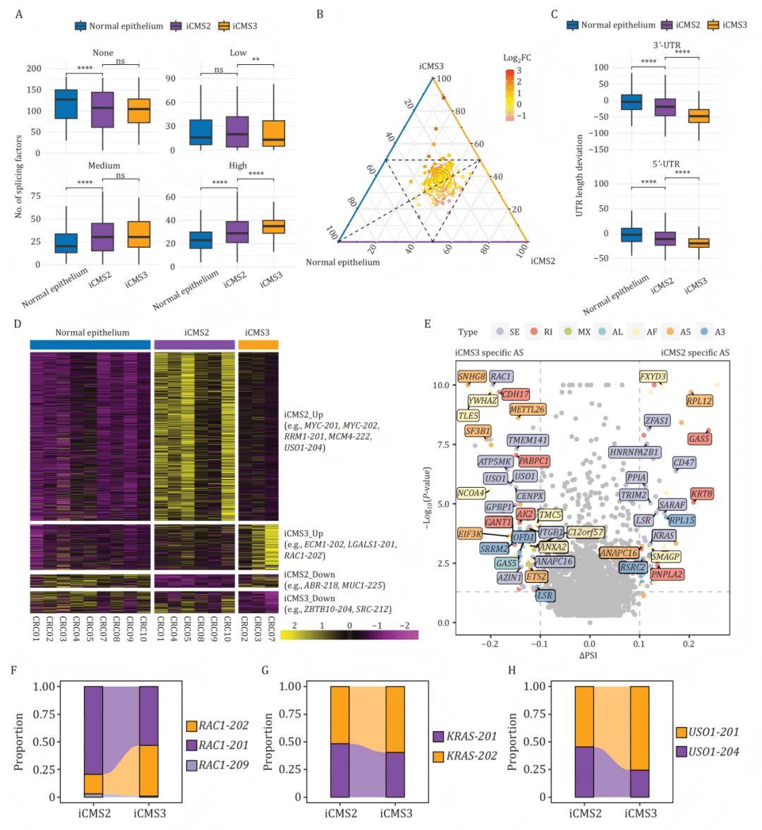 将全长转录组数据与 iCMS2/iCMS3 亚型信息结合后,研究揭示不同亚型具有独特的剪接模式、UTR 结构与 isoform 组合。iCMS3(炎症主导型)细胞呈现更明显的剪接重塑与 isoform 多样性,而 iCMS2(增殖主导型)则偏向结构保守型 isoform 表达。
