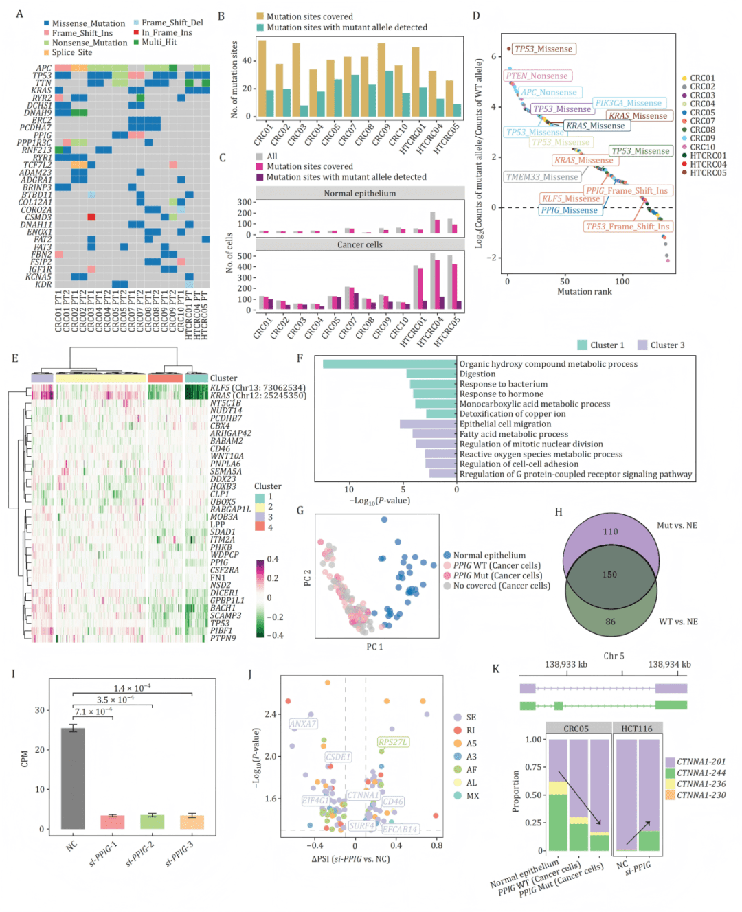 G-J:携带PPIG突变的癌细胞具有独特的剪接图谱;在细胞系中敲低PPIG可逆转部分异常剪接事件(如CTNNA1)。