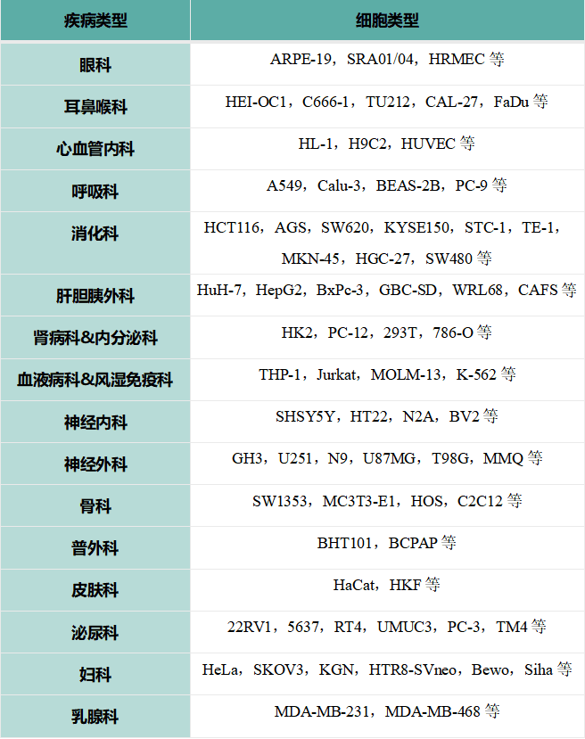 ✔ 我司具备百余种细胞培养和转染经验,涵盖各个疾病类型,如右表(包含但不限于此):