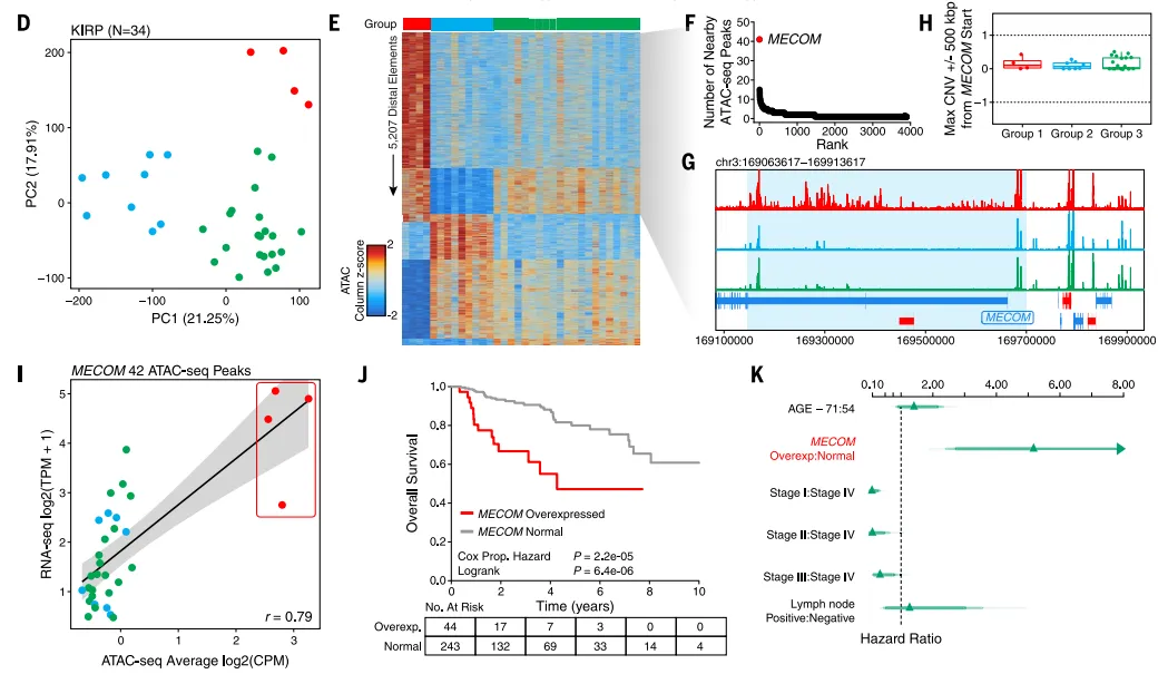 ATAC-seq数据对KIRP(一种肾癌类型)的分子分型研究发现图中红色代表了一种新的亚型,该亚型MECOM基因的染色质结合活性异常升高,这使得MECOM基因高表达。MECOM的过表达与较差的总生存率显著相关。