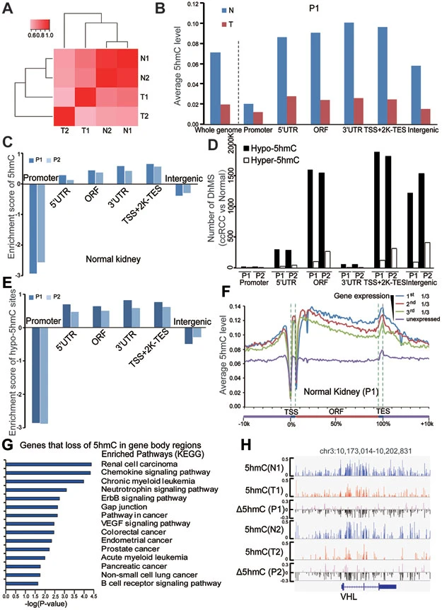 这项研究通过对正常肾脏组织和肾脏肿瘤组织进行BS-seq,分析发现:与匹配的正常组织相比,肾脏肿瘤中没有发生全基因组范围5mC丢失,而5hmC在几乎所有肾脏肿瘤组织中全范围丢失。肿瘤组织中的5hmC水平是肾癌的独立预后标志,5hmC水平越低总生存期越短。肿瘤中5hmC的丢失与高甲基化有关,特别是在基因区域。研究结果表明,5hmC缺失通过重构DNA甲基化模式,既是一种预后标志物,也是肾癌的致癌事件。