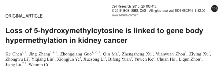 Chen, K., . Zhang, Z. Guo, Q. Ma, Z. Xu, Y Zhou, Z. Xu, Z. Li,Y. Liu, X. Ye, X. Li, B. Yuan, Y Ke, c. He, L. Zhou, J. Liu and W.Ci (2016).”Loss of 5-hydroxymethylcytosine is linked to genebodyhypermethylation in kidney cancer” Cell Res 26(1): 103-118.