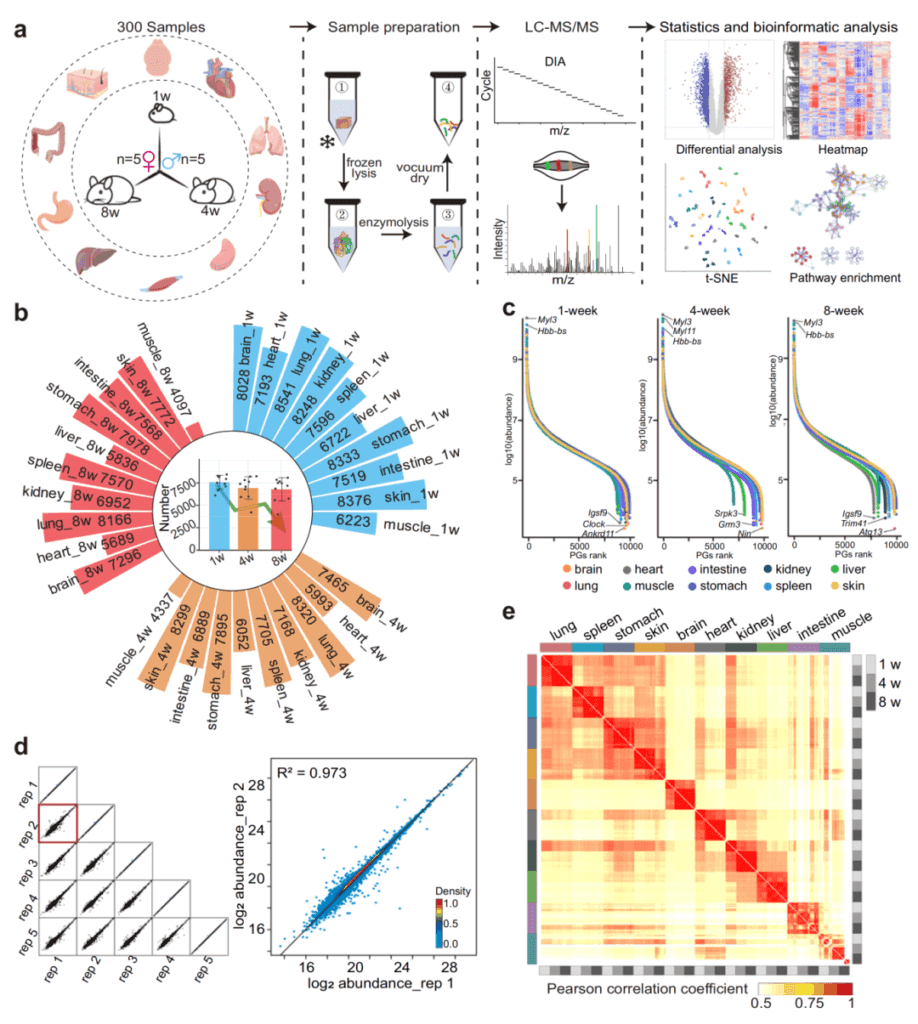 2024年7月,上海交通大学生物医学工程学院团队在Nature Communications上发表了题为“The mouse multi-organ proteome from infancy to adulthood”的研究文章。该研究通过DIA蛋白质组学分析了十种小鼠器官在三个关键发育阶段的蛋白质组学变化,研究结果为理解生命早期器官发育和成熟的分子机制提供了基本资源