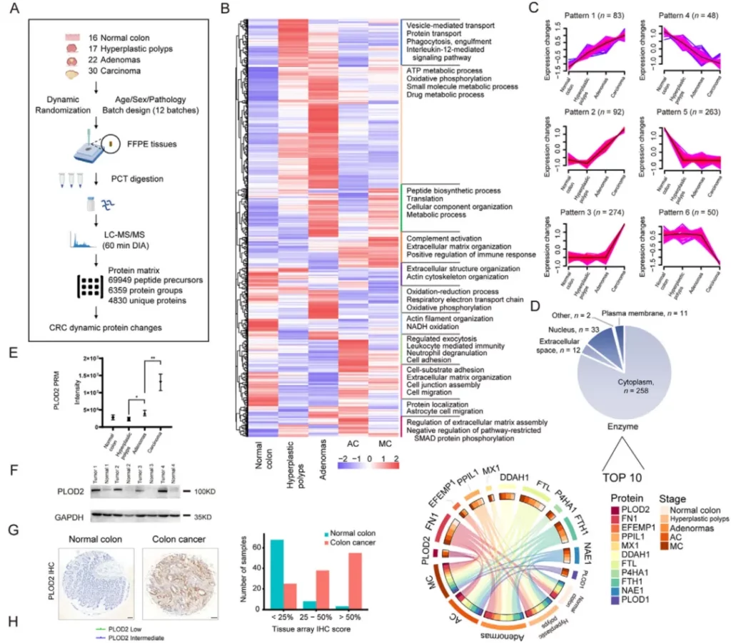 研究人员通过比较不同临床分期的结直肠癌样本和正常结肠组织样本中的蛋白质表达,鉴定了928种差异表达的蛋白质,并表明这些失调的蛋白质主要与氧化磷酸化有关。通过无监督聚类分析确定了6种与结直肠癌发生发展相关的具有生物学意义的蛋白质表达模式,接下来,研究人员继续关注范围缩小到在肿瘤进展阶段持续上调的蛋白质,发现PLOD2是上调最多的蛋白质,且与良性样本相比,其在癌前和癌变样本中始终显著上调,之后通过PRM靶向蛋白质组学技术、Western blot实验和免疫组化染色进行了证实。
