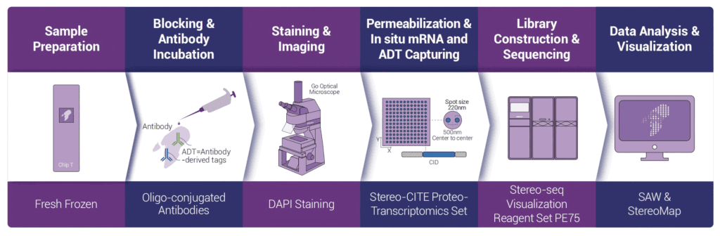 Epitopes by Sequencing (CITE-seq) with the Stereo-seq workflow. It captures mRNA and antibody-derived tags (ADTs) at nanoscale resolution across a centimeter-scale field of view. Through a streamlined “tissue-to-data” workflow, the system delivers spatial maps of transcriptome and protein expression via sequencing and visualization.