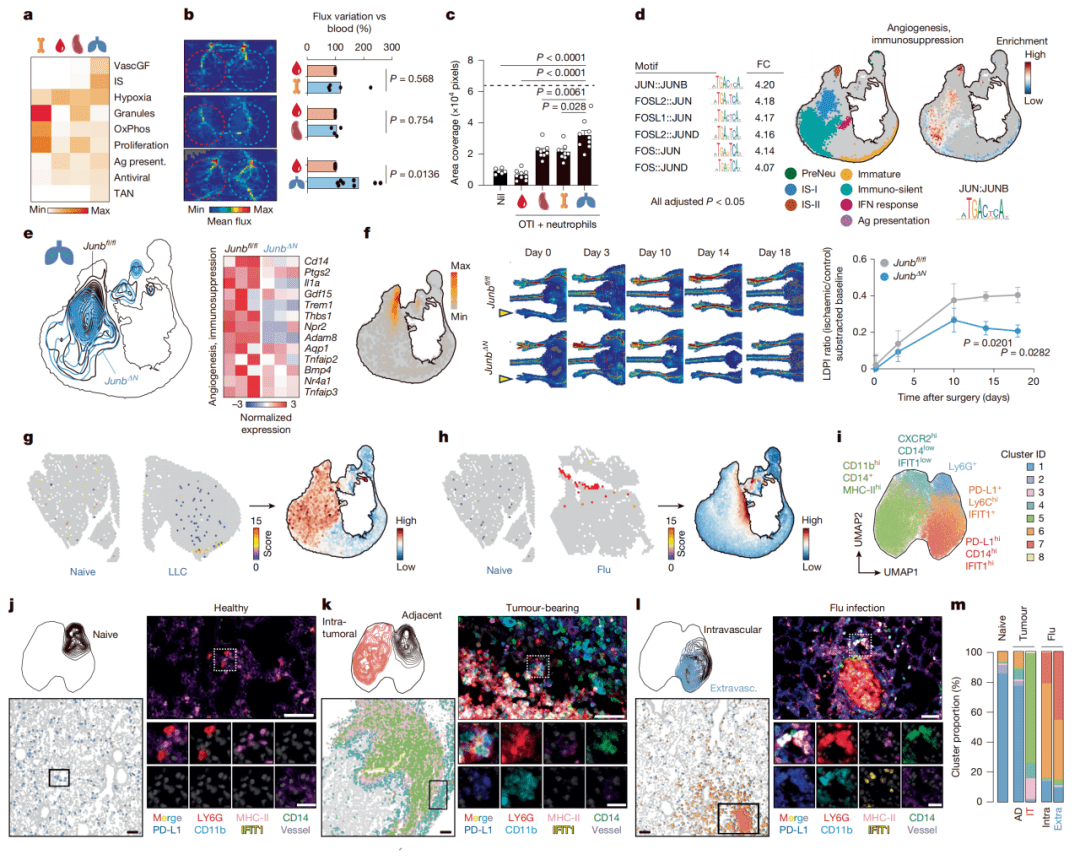 通过体外与体内实验验证图谱预测。例如,分离肺、肝脏等组织的CD14+ Ptgs2+ 中性粒细胞(IS-I枢纽),证实其具有更强的促血管生成和抑制T细胞杀伤的能力。利用空间转录组和多色荧光成像,展示不同枢纽的中性粒细胞在组织(如肿瘤边缘、感染灶周围)中具有特异的微解剖定位。通过构建中性粒细胞特异性JunB基因敲除小鼠,证实转录因子AP-1(尤其是JUNB)是调控IS-I枢纽免疫抑制和促血管生成功能的关键分子开关。