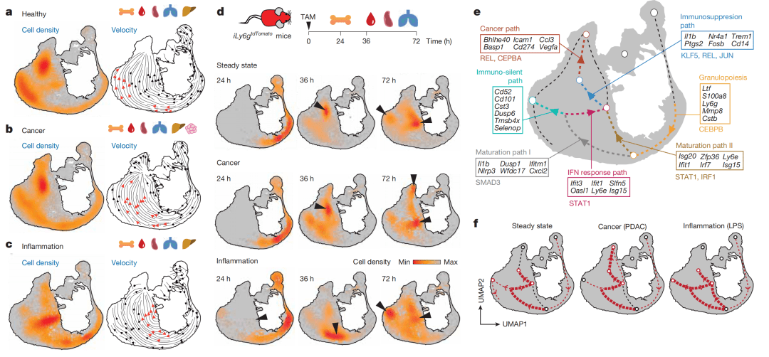● a-c图(状态特异性轨迹):分别展示了健康、肿瘤(PDAC)和炎症(LPS)小鼠的中性粒细胞在NeuMap上的密度分布(背景颜色),并叠加了RNA速率分析预测的细胞运动方向(箭头)。结果显示:健康状态下,细胞主要从未成熟枢纽流向免疫静默枢纽;肿瘤状态下,流向免疫抑制枢纽(IS-I/II);炎症状态下,则强烈流向干扰素应答枢纽。