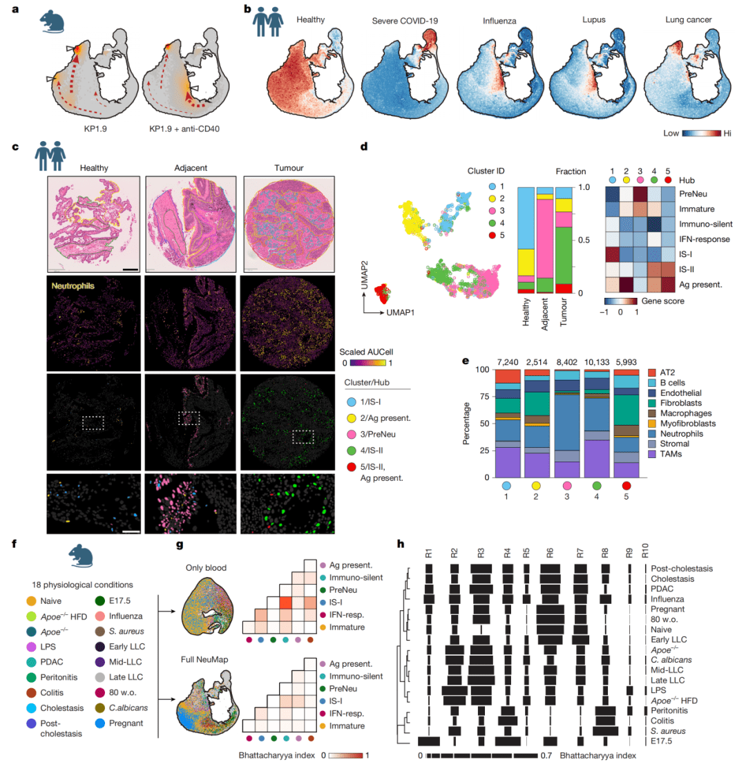 ● a图(示意图):展示了构建NeuMap所使用的实验设计,包括采集自不同发育阶段、性别、年龄以及健康与疾病(如癌症、感染、炎症)共47种条件下,来自13个组织的中性粒细胞进行单细胞测序。