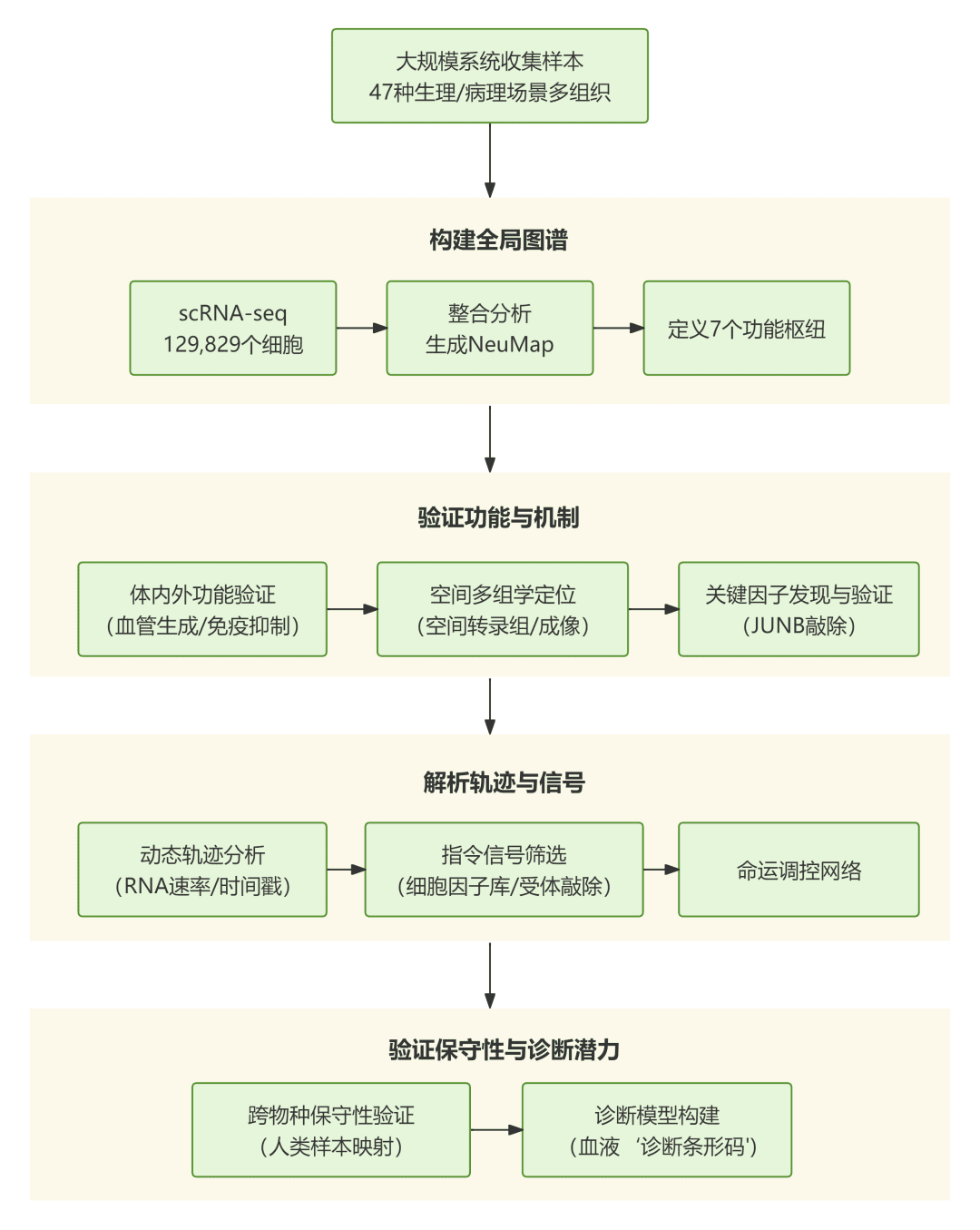 成功构建首个跨多组织/疾病的中性粒细胞全局单细胞图谱(NeuMap),揭示其转录状态构成一个连续统一体,并划分为七个功能特异的功能枢纽。