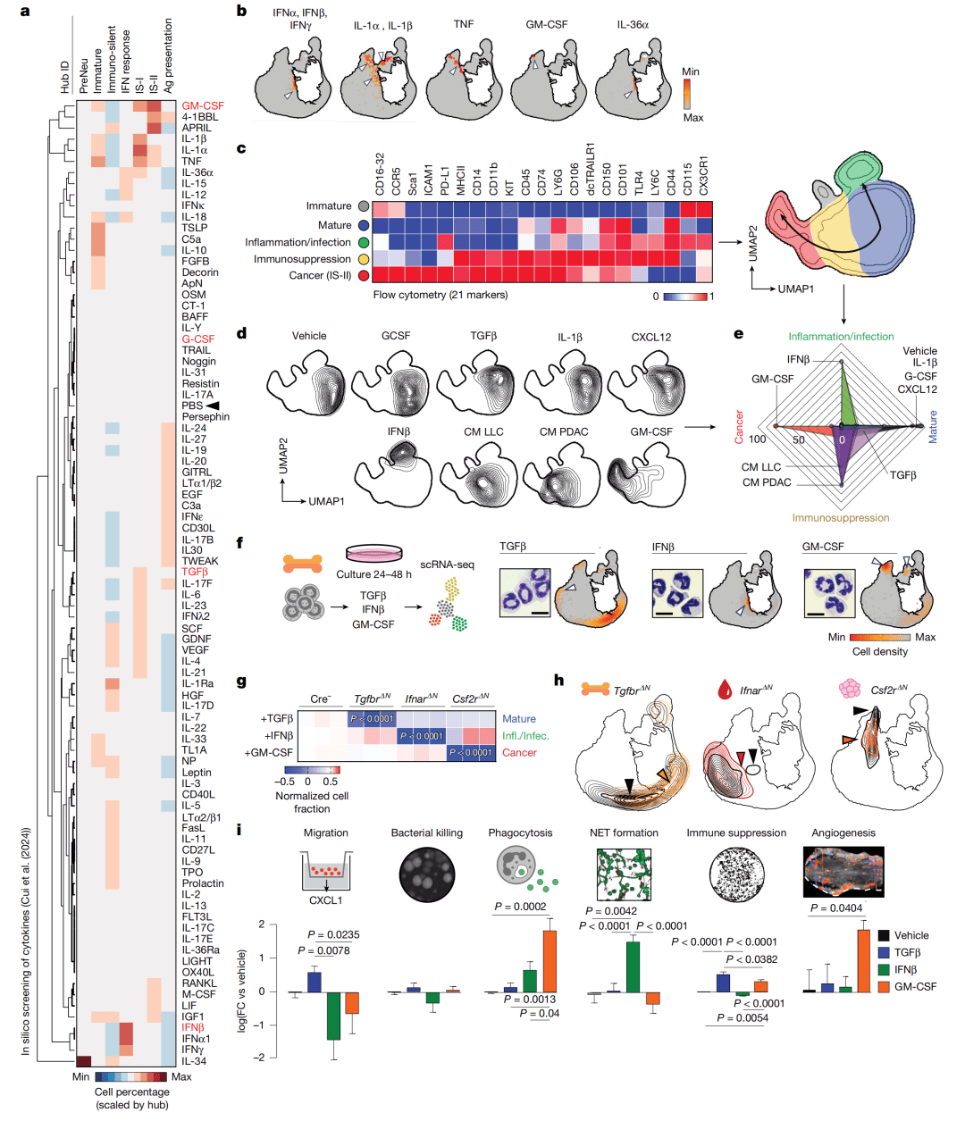 ● c-e图(体外验证与表型分析):用不同细胞因子处理骨髓来源中性粒细胞,并通过21色流式细胞术分析。c图UMAP和热图定义了5个表型群。d-e图证实TGFβ诱导成熟表型,IFNβ诱导炎症表型,GM-CSF和肿瘤条件培养基诱导癌症相关/免疫抑制表型。