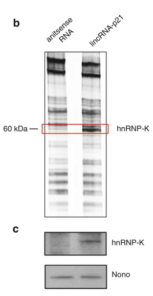 结合到lincRNA-p21的蛋白质的SDS-PAGE凝胶(右泳道)或反义RNA(左泳道)的结果展示。hnRNP-K被鉴定为lincRNA-p21特有的条带。hnRNP-K与lincRNA-p21的特异性结合的Western印迹分析,同时显示了一种非特异性蛋白(NONO)作为对照。