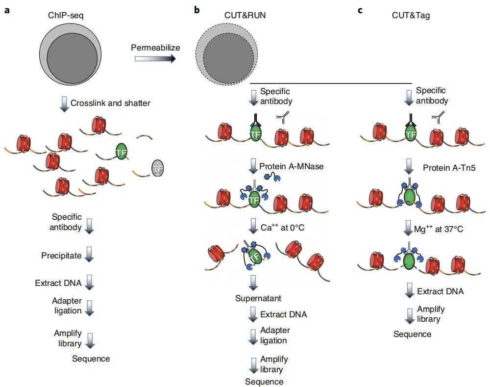 CUT&Tag使用蛋白A-Tn5转座酶融合蛋白在抗体指引下直接对目标蛋白周围的DNA进行切割和标签插入,极大提高了信噪比和实验效率。
