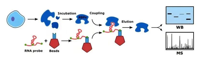 将体外转录的RNA进行生物素标记,与细胞裂解液共同孵育后,通过链霉亲和素磁珠富集与RNA相互作用的蛋白质,最后通过WB或质谱进行鉴定。