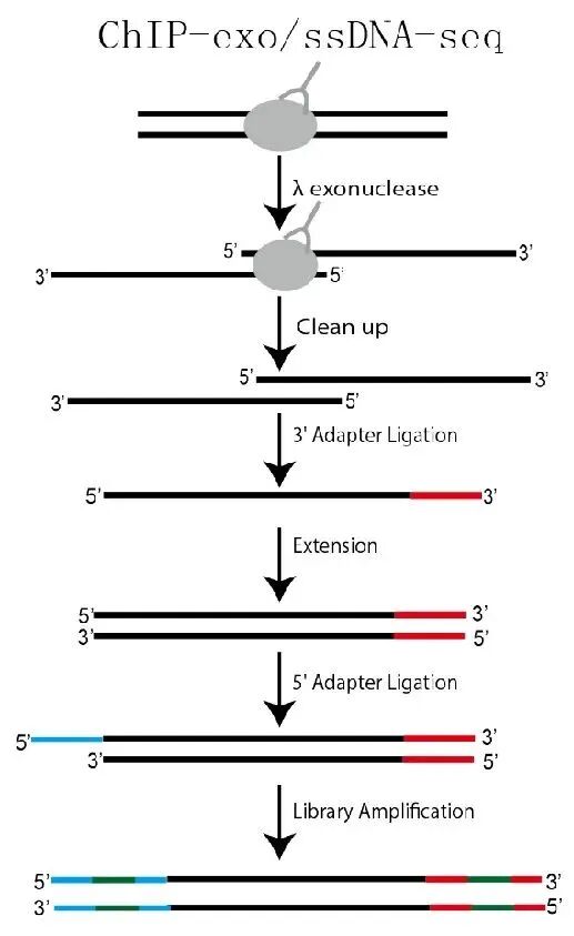 ChIP-exo使用λ-核酸外切酶处理免疫沉淀获得的蛋白质-DNA复合物,λ-核酸外切酶沿5’-3’方向切割DNA双链中的一条链,直到碰到交联蛋白质才停止反应,能够将蛋白质结合位点精确映射到单个核苷酸分辨率。