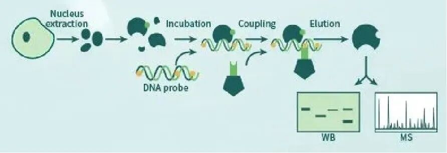 将生物素标记的DNA探针与细胞核提取物孵育,富集结合蛋白后进行鉴定。