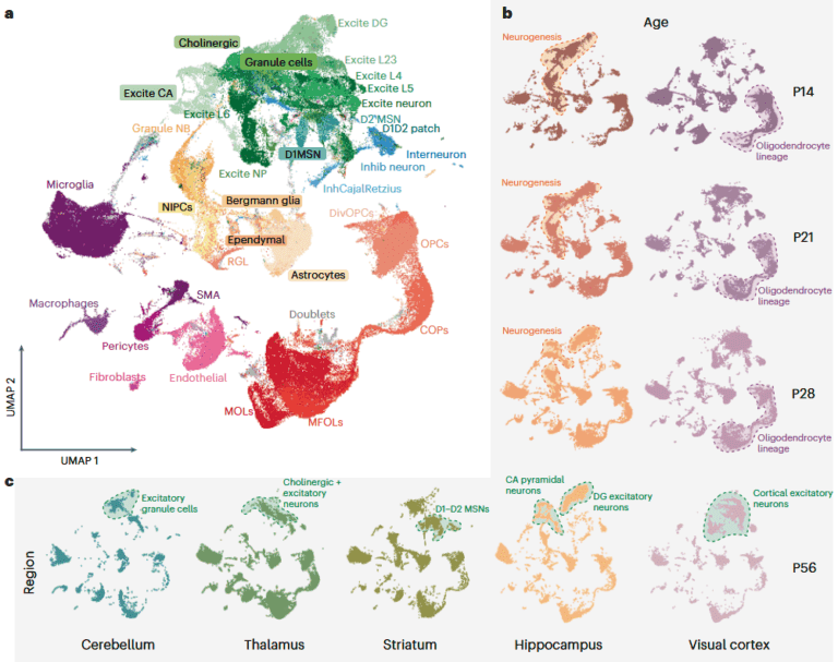 涵盖不同发育阶段(P14、P21、P28和P56)和多个脑区(海马体、视觉皮层、纹状体、丘脑、小脑)的小鼠样本,同时也获取了6份健康人类大脑样本(包括海马体,其中三男三女)。