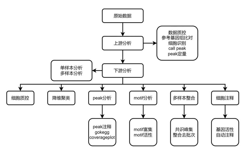 从生物样本(如组织等)中分离出细胞核,接着对细胞核进行转座酶处理,使染色质开放区域 DNA 片段化,然后利用DNBelab C系列平台进行单细胞分选,将处理后的 DNA 构建文库,再通过测序获取数据,后续经数据分析(如峰识别、聚类、 motif 富集等),以解析单细胞染色质可及性信息 。
