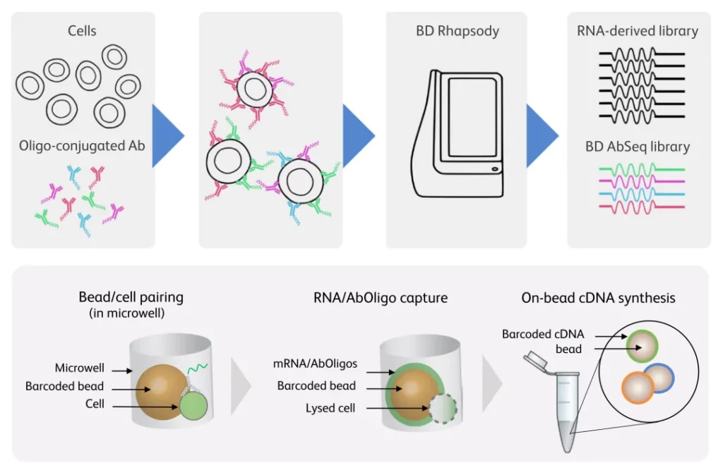 使用寡核苷酸偶联抗体(AbSeq抗体)与单细胞进行特异性结合,通过二代测序技术,获得单细胞水平上的蛋白表达信.。