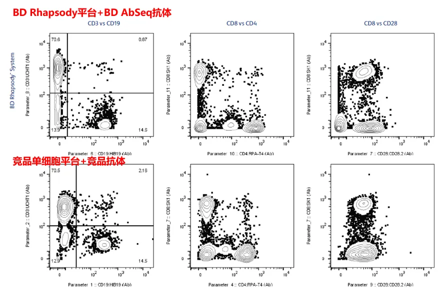 从BD和竞品中选择相同克隆的抗体,使用相同浓度的BD AbSeq或竞品,对同一来源、相同数量的细胞进行孵育。BD Rhapsody™ 系统上的AbSeq在分辨率上明显于竞品。