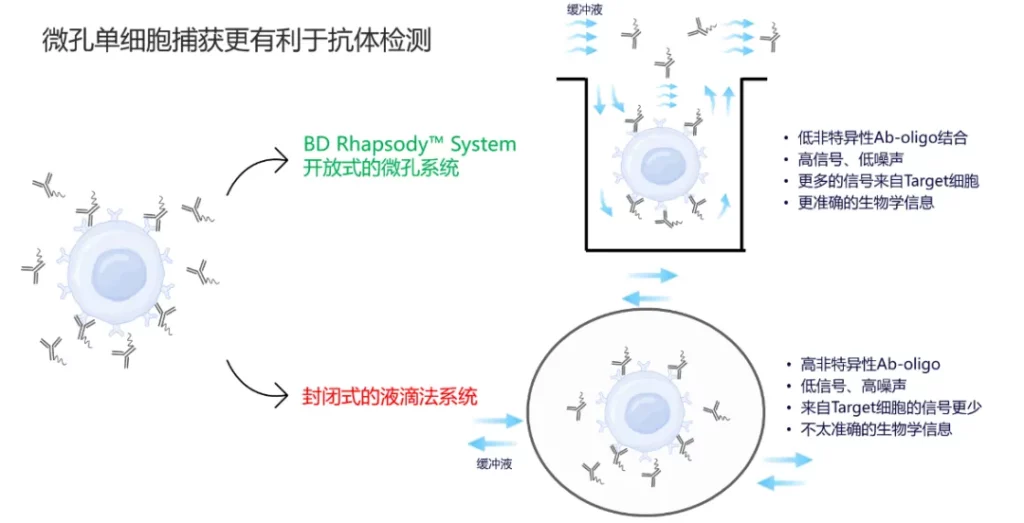 BD单细胞微孔分离捕获方法,未与Target细胞结合的Ab-oligo抗体更容易在多次的wash步骤中被彻底清洗去除,从而确保后续被检测到的都是与Target 细胞结合了的抗体,具有更高的信噪比,揭示更准确的生物学信息。
