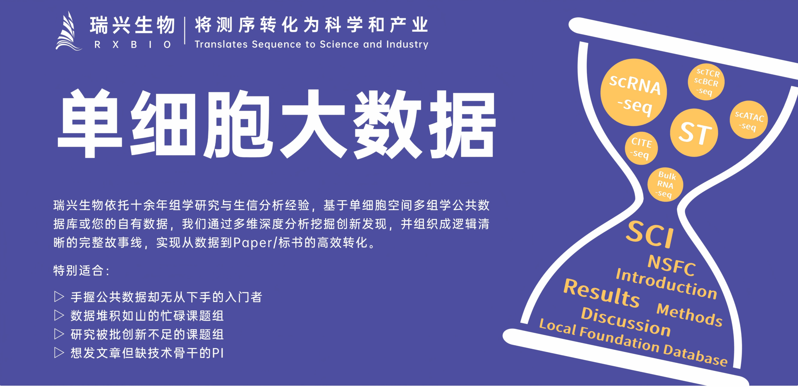 瑞兴生物基于10X、BD、华大智造等前沿平台,提供单细胞空间多组学一站式解决方案,支持项目设计-解离/质检-建库测序-基础分析-深度挖掘-成果转化,让科研高效,让创新加速!