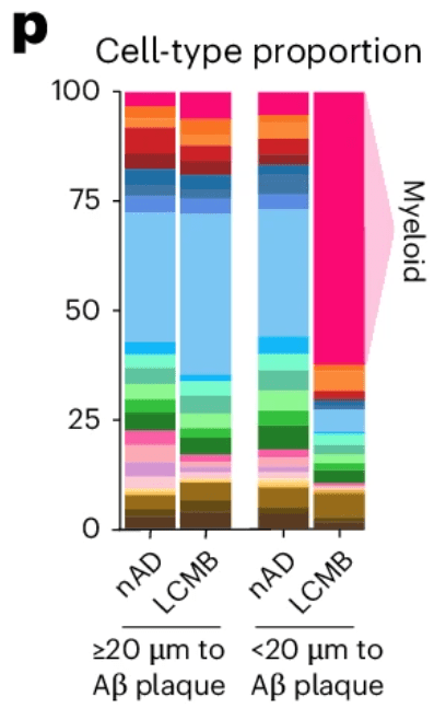 最近一项研究检查了未免疫和免疫的阿尔茨海默病患者的淀粉样蛋白清除率。在两组中,当观察淀粉样斑块 >20 μm 的细胞时,细胞组成基本相似。当观察来自斑块 <20 μm 的细胞时,未免疫的细胞组成基本保持不变,但免疫患者的髓系细胞急剧增加(>50% 的总细胞),这凸显了空间定位在检查药物反应时的重要性。