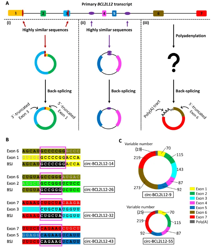 在鉴定出的 46 种 circRNAs 中,研究人员观察到 40 种不同的反向剪接位点(BSJ)。大部分 circRNAs 的反向剪接位点不符合规范,并且在多数情形下,形成 BSJ 的前体 mRNA 区域具备高度的序列相似性。此外,研究还发现 2 种 circRNAs(circ – BCL2L12 – 9 和 circ – BCL2L12 – 55)含有类似于信使核糖核酸(mRNA)多聚腺苷酸尾(poly (A) tail)的多聚腺苷酸(poly (A))片段,这一发现对传统的 circRNAs 认知提出了挑战。