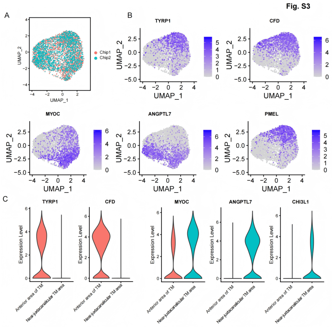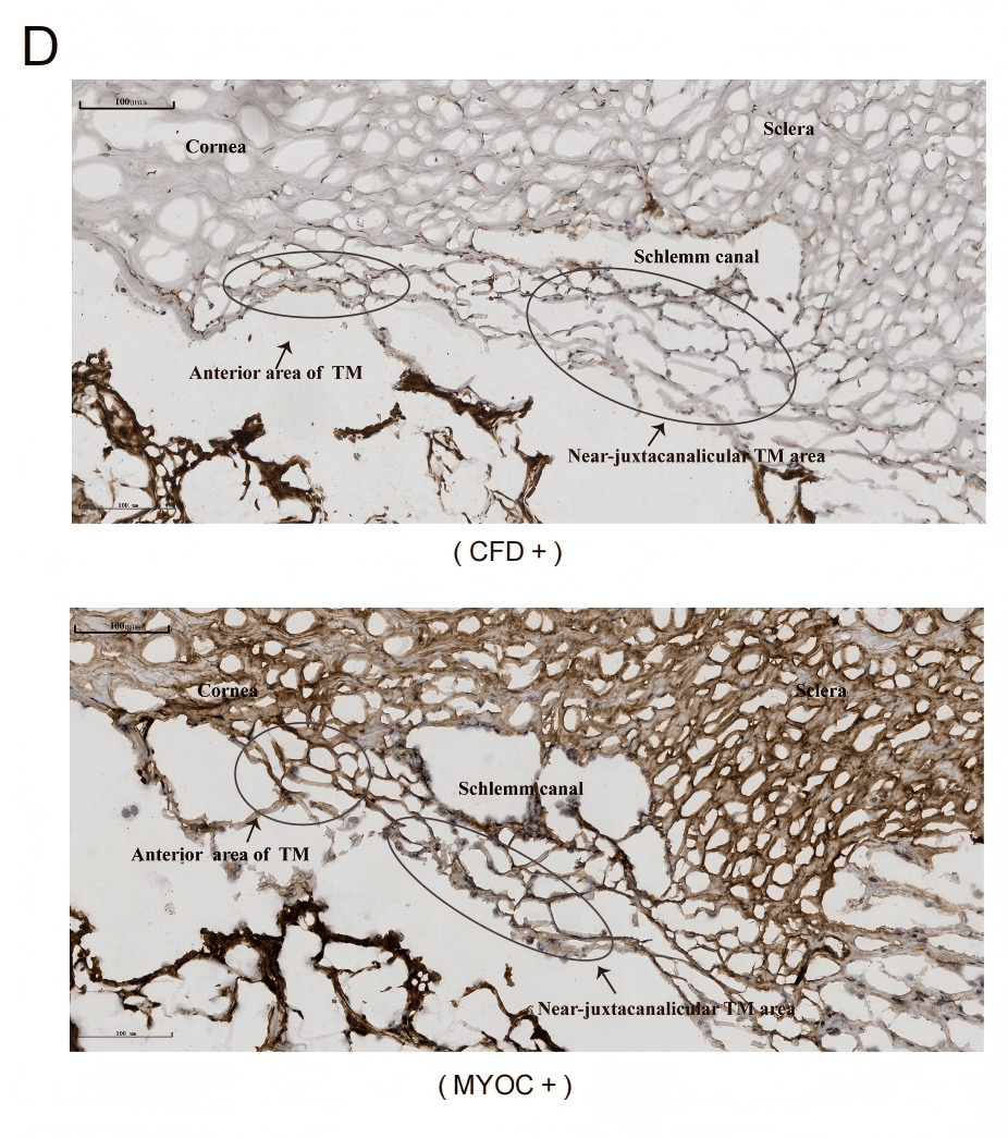 -近小管连接区TM(Near-juxtacanalicular TM area):毗邻Schlemm管,特异性高表达房水流出功能基因(CHI3L1、ANGPTL7、MYOC),并富集黑色素合成、脂类代谢及细胞外基质重塑通路。免疫组化验证证实CFD在前部TM高表达,而MYOC在近小管区优势表达。