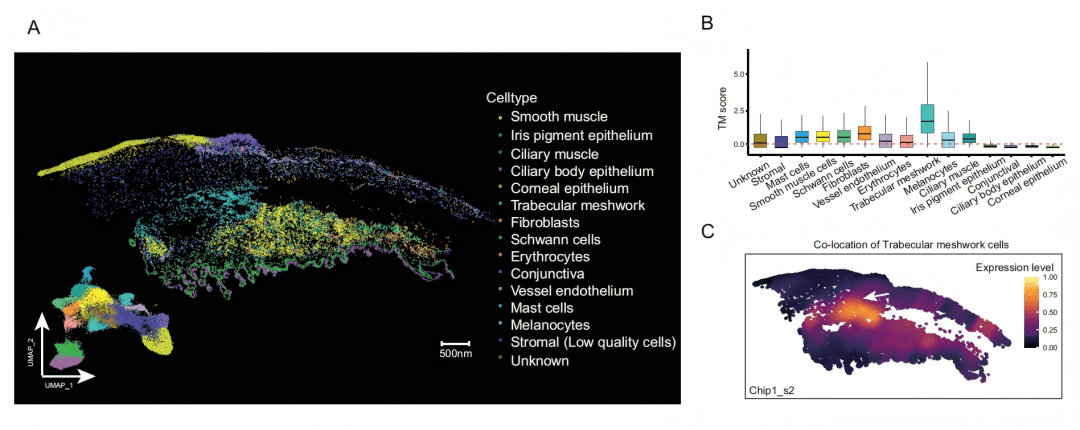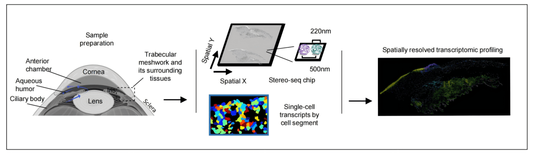 -样本处理:4例人眼样本的小梁网(TM)及周围组织制备为2个Stereo-seq芯片(10μm),同步进行Stereo-seq和H&E染色验证组织形态。