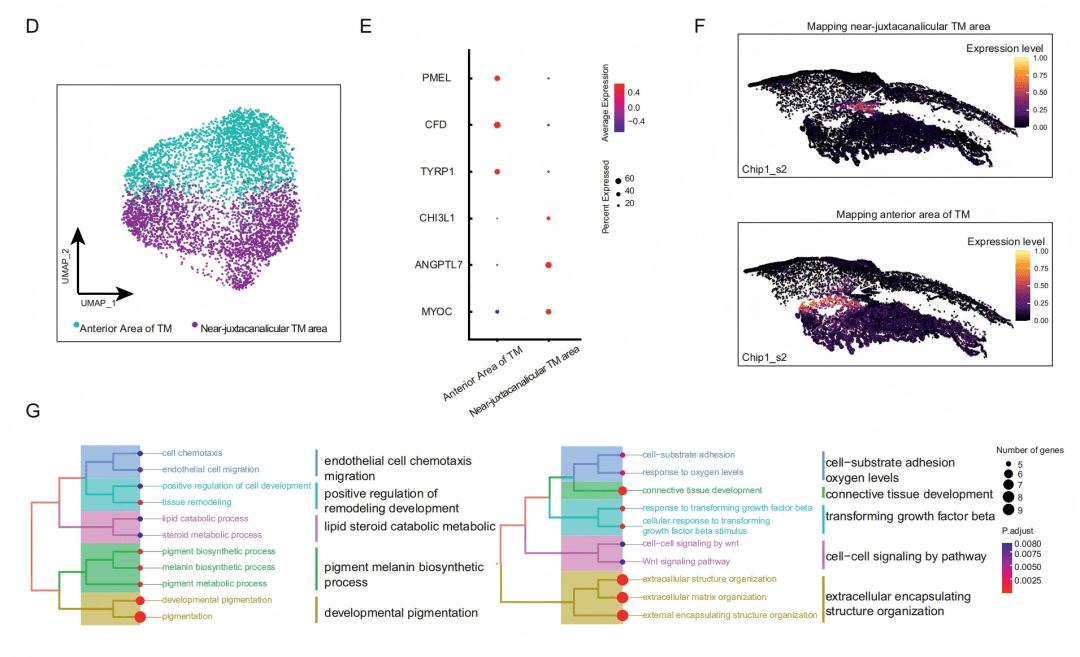 –前部TM区(Anterior TM area):位于TM前端,高表达纤维化相关和黑色素生成标记基因(如CFD、TYRP1),可能作为房水流出的过渡区,基因富集分析表明,该区域参与细胞-底物黏附、结缔组织形成、对转化生长因子-β和氧水平的敏感性以及细胞-细胞WNT信号等生物学功能。