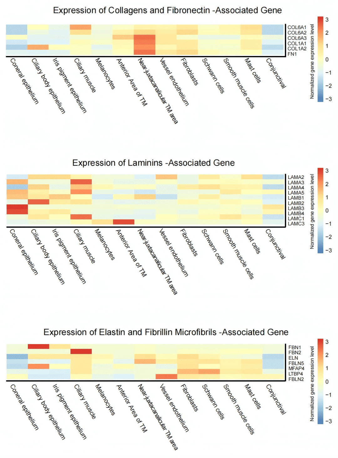 -层粘连蛋白基因(LAMA2-5、LAMB1-4)和弹性纤维基因(FBN1、ELN)主要在上皮及睫状肌表达,仅LAMC3在前部TM区显著表达),凸显TM亚群在ECM调控中的分工差异,为开发亚群特异性抗ECM纤维化药物提供依据。
