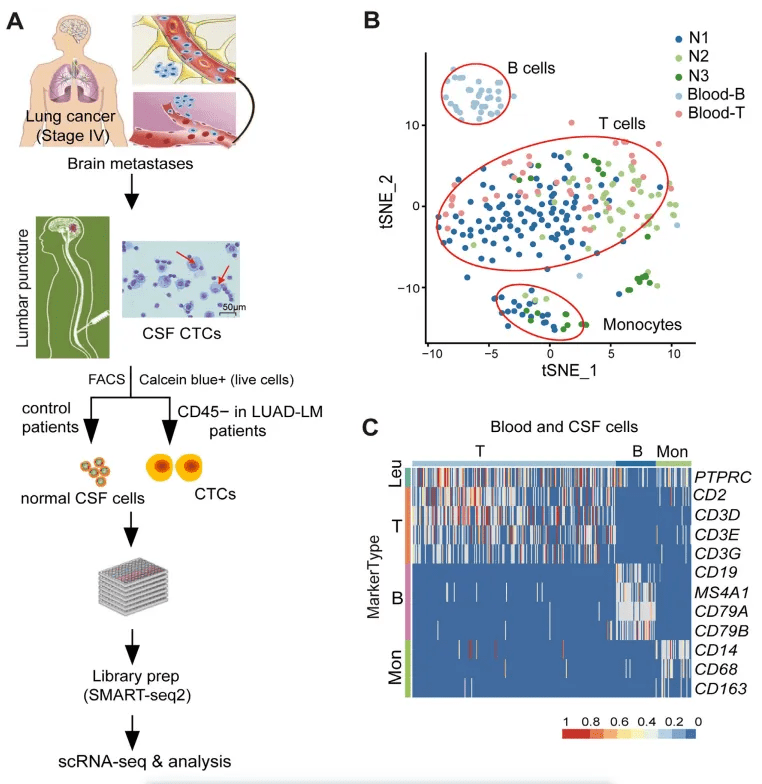 研究人员建立了一种有效的脑脊液循环肿瘤细胞(CSF-CTCs)收集方法,从5例肺腺癌柔脑膜转移(LUAD-LM)患者和3例对照组中分离出单个脑脊液细胞。利用Smart-seq2技术对3792个细胞进行单细胞测序,对脑脊液细胞的基因表达情况进行了全面表征。过滤掉低质量细胞后,文章分析了207个正常脑脊液细胞,41个B细胞,41个T细胞。平均每个细胞检测到803个基因表达。聚类分析发现正常淋巴细胞在不同微环境下具有相似的表达谱。正常脑脊液样本未发现B细胞。