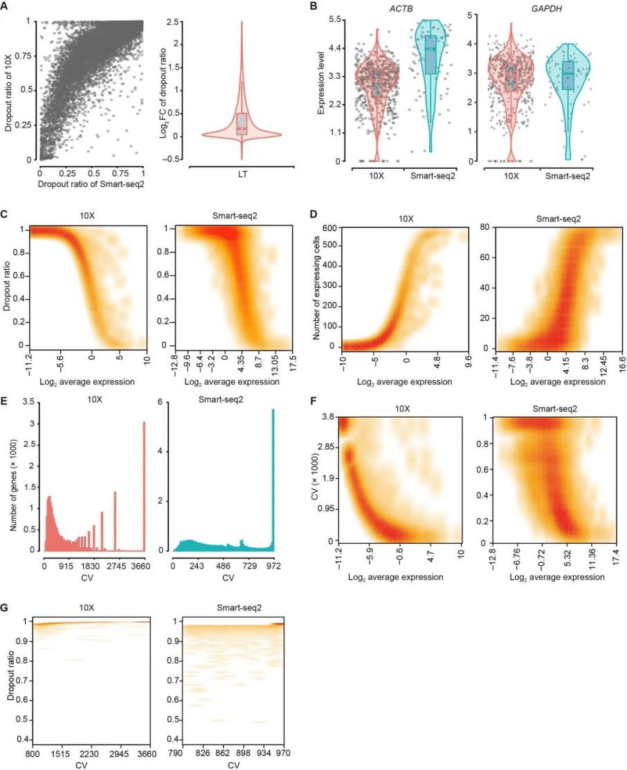 10x中dropout率高于Smart-seq2,以LT细胞中的HK基因为例10x中dropout率也高于Smart-seq2,表达水平较低的基因具有较高的dropout率。在10x中从较少数量的细胞中检测到丰度较低的基因,这些基因可能导致更高的噪音。作者还发现基因表达变异系数 (CV) 与dropout率相关(CV常用来来衡量某基因在某些样本的表达变化情况),其中具有较大CV的基因通常表达较低,尤其是对于10x来说,同时具有较大CV的基因也具有较高的dropout率。