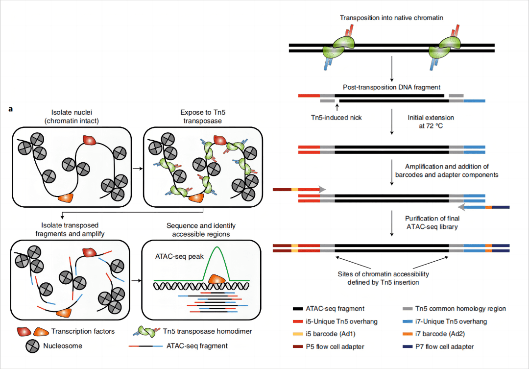 2013年,美国斯坦福大学Howard Y. Chang研究团队开发了用于研究染色质可及性的方法ATAC-seq,其原理是通过转座酶Tn5容易结合在开放染色质的特性,然后对Tn5酶捕获到的DNA序列进行测序。ATAC-seq由于所需细胞量少,实验简单,可在全基因组范围内检测染色质可及性,已成为相关研究的首选技术方法。