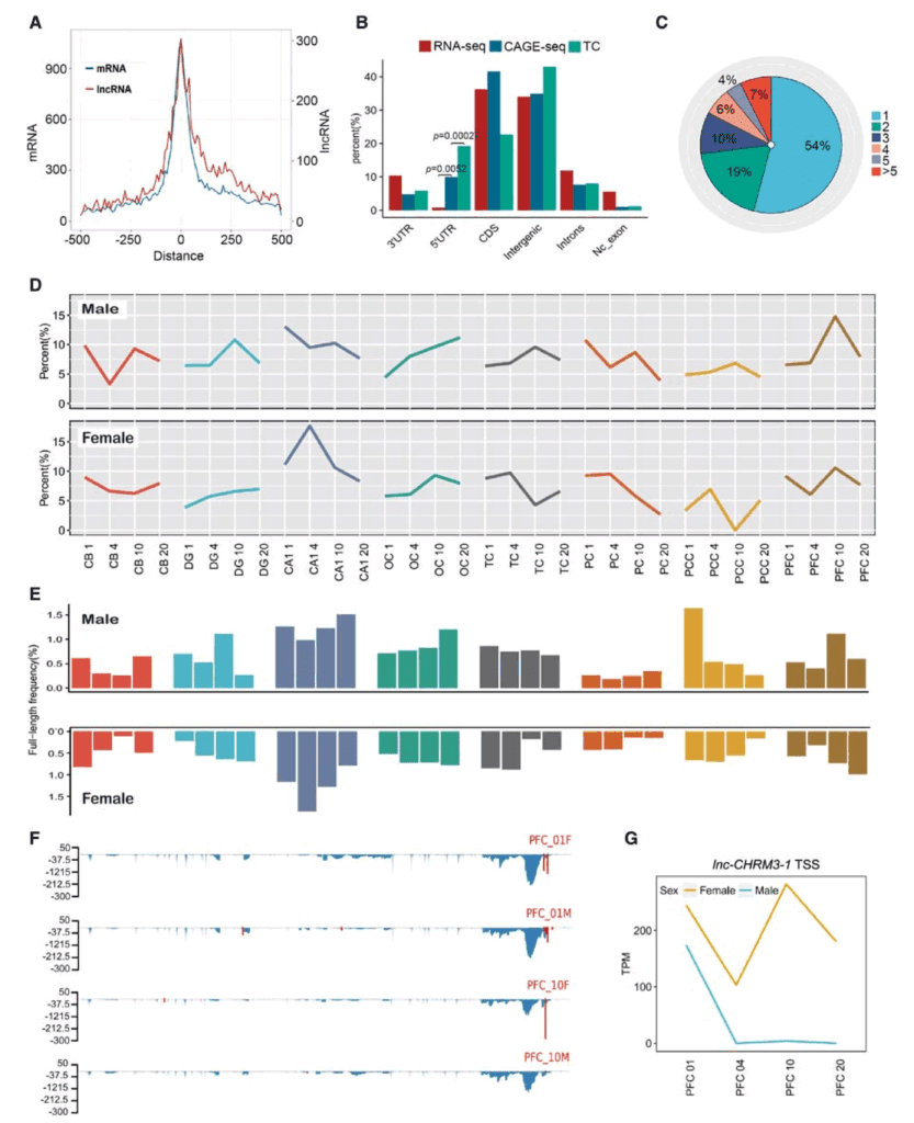 在此基础上,利用CAGE-seq对lncRNA和mRNA启动子区域进行测序和分析,发现lncRNAs的启动子区域变化比mRNA呈现出更明显的性别差异和时空变化性状。