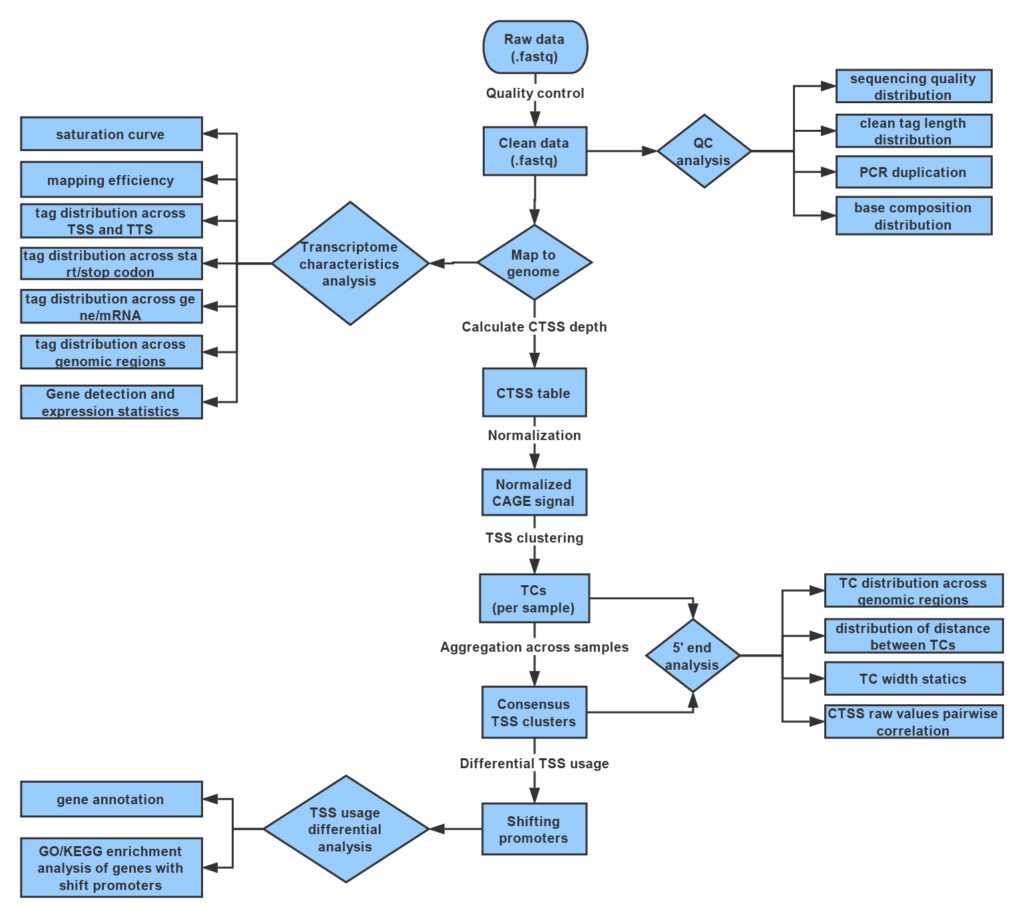 CAGE-seq,即加帽端mRNA测序,主要是鉴定转录起始位点(TSS)。绝大多数基因有两个甚至两个以上的转录起始位点,不同的转录起始位点会导致基因受到不同的上游非翻译区的调控作用(5’UTR)。不同的5’UTR序列中可能包含截然不同的作用元件,不同的起始位点导致了基因的表达所响应的信号也完全不同。同一个基因有可能受不同的启动子调控而导致表达的差异,可能会导致某些疾病的发生。CAGE-seq可以对mRNA中所有的TSS进行鉴定,发现新的启动子,以及差异表达分析,还可以推测可能的转录因子结合位点以及基因表达的网络调控。这是通过加帽位点鉴定实现的。