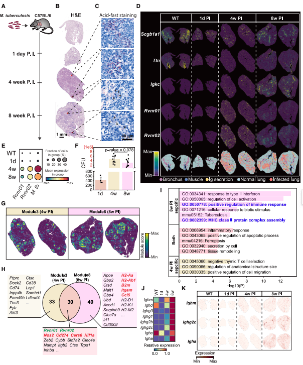 Stereo-seq V2技术的随机引物策略,如同“全景扫描仪”,能同时、无偏地捕获样本中所有人类基因与微生物RNA。研究发现,该技术在结核分枝杆菌(Mtb)感染的小鼠模型中,成功同时捕获宿主与病原体RNA,不仅能动态监测感染过程中双方的基因表达变化,还精准发现了与Mtb 空间分布直接相关的免疫应答模块,清晰构建出“病原体入侵 – 宿主防御”的空间关联图谱。