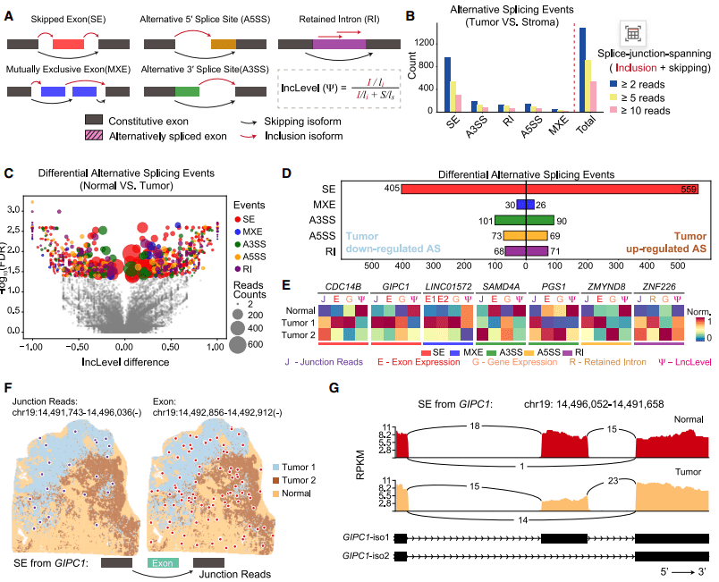 图2. Stereo-seq V2技术识别肿瘤相关可变剪接(AS)事件