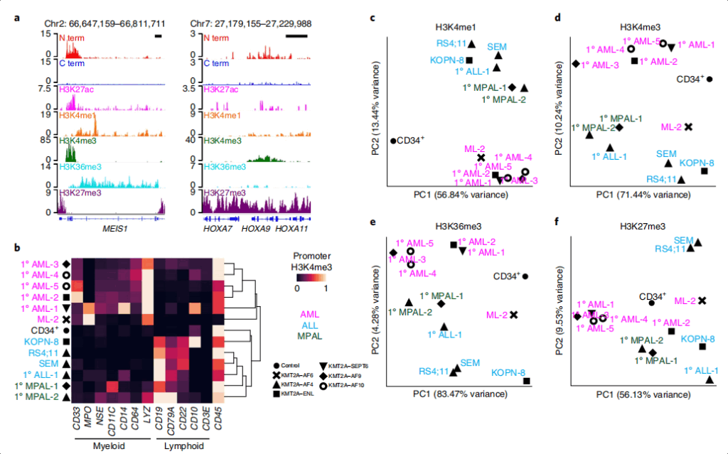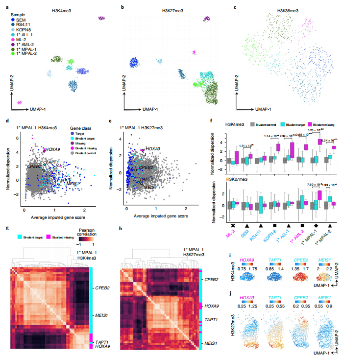 研究团队利用AutoCUT&Tag分析白血病样本中的组蛋白修饰,发现了具有二价染色质特征的KMT2A肿瘤融合蛋白位点。KMT2A肿瘤融合结合位点的一个子集被二价(H3K4me3和H3K27me3)染色质标记,并且这些位点上的二价染色质特征与同一肿瘤细胞之间的异质性相关,这表明混合谱系白血病细胞群体中基因表达的异质性源于染色质动力学。