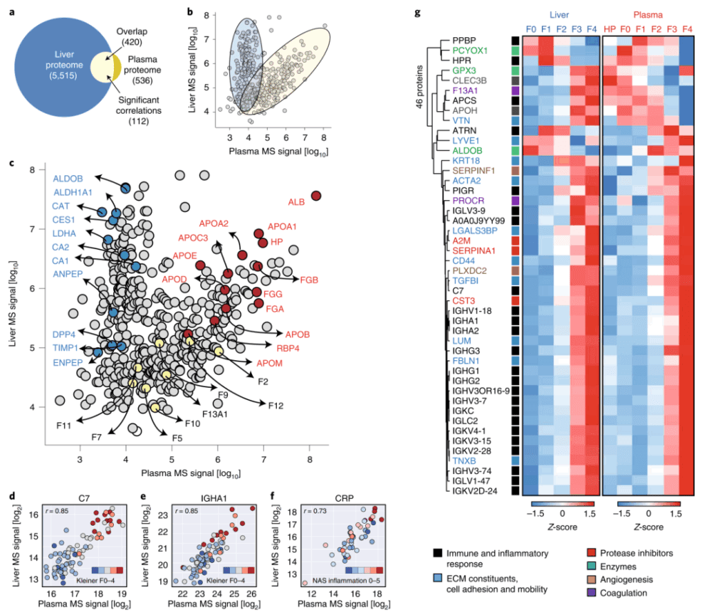 研究人员首先基于DIA技术分析了酒精相关性肝病(ALD)患者和健康对照者的血浆样本和相匹配的肝脏活检样本。通过整合肝脏-血浆蛋白质组数据表明420种蛋白质同时出现在肝脏和血浆定量蛋白质组中,其中一些蛋白质的相对丰度在肝脏和血浆中具有很强的相关性。此外,利用机器学习算法鉴定了三组标志物用以识别显著纤维化(9种蛋白)、轻度炎症活动(6种蛋白)和任何程度的肝脂肪变性(6种蛋白),最后,在独立队列中验证模型性能和评估预后能力。总之,这项研究表明肝脏和血浆中的共同失调蛋白代表了慢性肝病的不同方面,并提供了在ALD中具有诊断、预后和治疗价值的潜在蛋白质靶点。